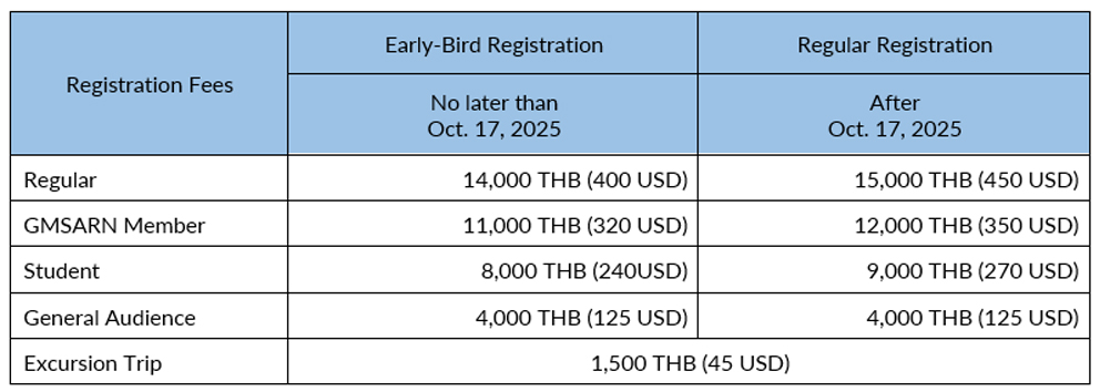 This fee covers costs of lunch, refreshments, reception dinner and conference kit. The registration form and payment information can be downloaded from the website: https://gmsarnconference.com/conference2025